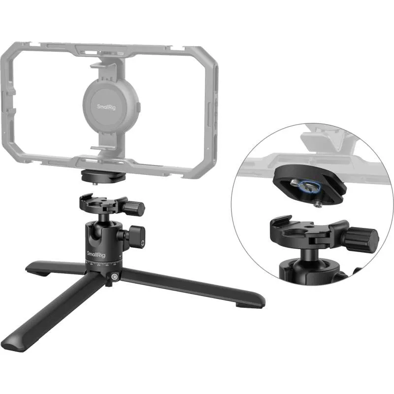 SmallRig Metal Tabletop Tripod ar Arca-Swiss Quick Release Plate un panorāmas lodveida galvu 4630 piedāvā risinājumus makrofotogrāfijai, viedtālruņu fotografēšanai, tiešraidei un fotografēšanai ierobežotās telpās. Tas nodrošina stabilu atbalstu mazām DSLR, bezspoguļa kamerām, viedtālruņiem, darbības kamerām u. c. un ļauj veikt darbības uzņemšanu no rokas. Izgatavota no augstas kvalitātes alumīnija sakausējuma, lodveida galvas lietderīgā slodze ir līdz 5 kg, bet kājas var izturēt līdz 20 kg. Tā ir aprīkota ar neslīdošiem silikona kāju spilventiņiem, kas uzlabo berzi, lai novērstu slīdēšanu uz gludām virsmām uzņemšanas laikā. Panorāmas lodveida galva ir aprīkota ar izlīdzināšanas marķējumiem, kas atvieglo lietošanu, un ļauj panorāmas fotografēšanai veikt 360° panorāmas panoramēšanu. Lodveida galva atvieglo vairāku leņķu regulēšanu un vienmērīgu pāreju starp ainavas un portreta orientāciju. Statīvs ir aprīkots ar Arca-Swiss ātrās atbrīvošanas plāksnīti, kas nodrošina vieglu un ātru ierīces montāžu un demontāžu.