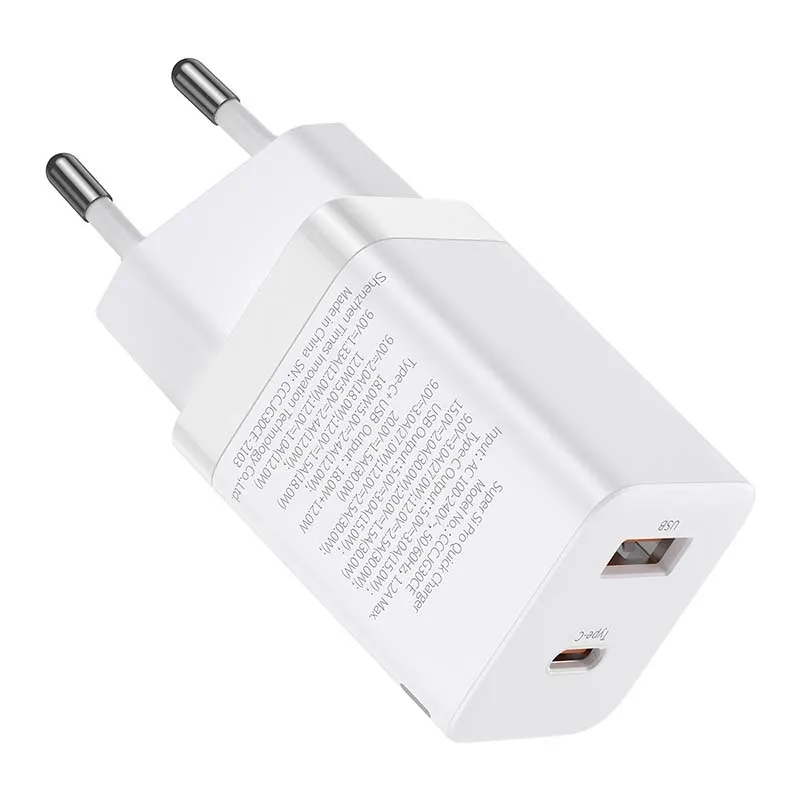 Piederumam ir dubulta pieslēgvieta: USB un USB-C, tāpēc varat uzlādēt 2 ierīces vienlaicīgi. Kompaktais dizains nodrošina ērtu glabāšanu, un vairākas drošības funkcijas aizsargā ierīci un piederumu no bojājumiem. Izstrādājums atbalsta arī ātrās uzlādes protokolus, lai ietaupītu jūsu laiku. 100-240 V maiņstrāvas spriegums ļauj to izmantot jebkurā pasaules vietā.