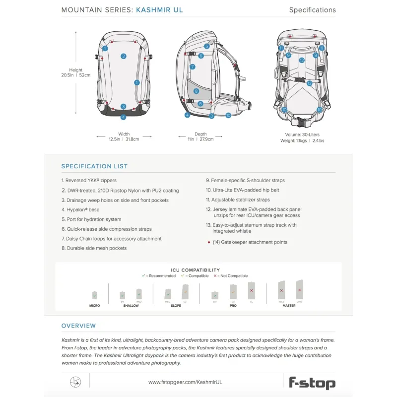 F-Stop Kashmir UL mugursoma ir īpaši viegla universāla soma, kas paredzēta aktīvām fotogrāfēm, kuras meklē ideālu risinājumu drošai sava aprīkojuma transportēšanai. Dizains ir stilīgs, taču ļoti funkcionāls. Tādējādi jūs varat ērti paņemt līdzi savu DSLR vai sistēmas kameru ar objektīvu, papildu objektīvus, zibspuldzi un statīvu, lai kurp jūs dotos! Viegla, bet izturīga konstrukcija Somas ietilpība ir 30 litri, un tai ir iekšējais alumīnija rāmis, kas īpaši pielāgots sieviešu augumam. Ārpuse ir izgatavota no izturīga neilona, kas ir arī izturīgs. Piemēram, mugursomas apdare ir ar ūdensizturīgu pārklājumu. Perfektam svara sadalījumam un papildu atbalstam ir torsa un vēdera josta ar ātru atvienošanu. Polsterētās plecu siksnas ir regulējamas, izturīgas un ērtas. Aizsardzība un ērtības vienā! pievērsiet uzmanību Šīs mugursomas ietilpība ir 30 litri, un tajā ir perfekti sabalansēts līdzsvars starp aprīkojumu un ikdienas priekšmetiem. Jums ir nepieciešams F-Stop Pro ICU, lai sakārtotu somu! F-Stop ICU ir pieejami dažādos izmēros. Guru UL jūs varat izvēlēties no mazā Pro ICU, mazā vai vidējā izmēra seklās ICU vai vidējā izmēra slīpās ICU.