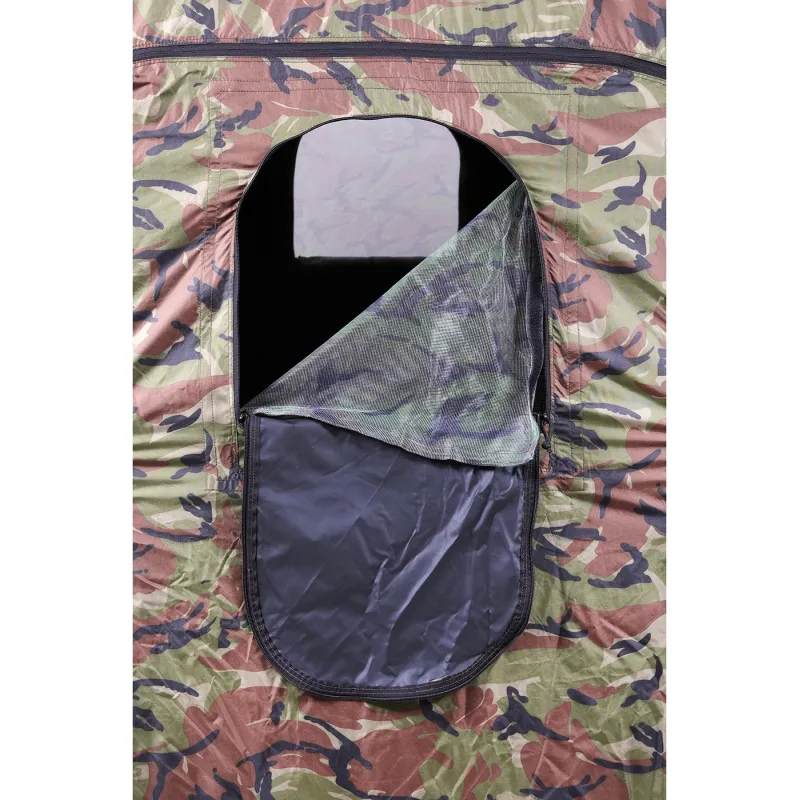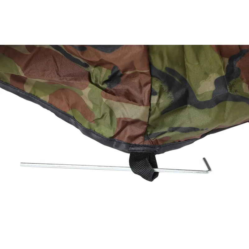 Kamuflāžas telts pilnais augstums rodas, pateicoties tam, ka tās iekšpusē tiek izmantoti 2 daudzdaļīgi pole. Šim nolūkam visos 4 stūros atradīsiet cilpas, kurās stieņi tiek iespīlēti un piestiprināti ar siksnām. Lai stabilizētu telti vējainā laikā, teltij ir pievienotas 4 vīriešu virves un 8 naglas. Praktiskajai transport somai ar aukliņu, kurā telts tiek novietota, ir ārējā kabata, un to var pārnēsāt kā mugursomu.