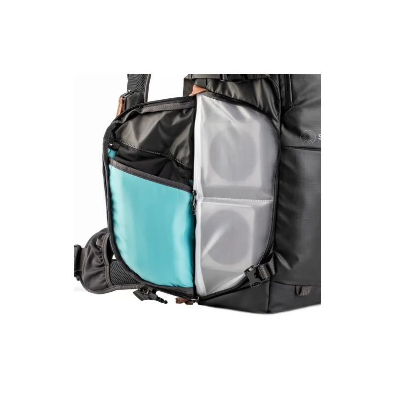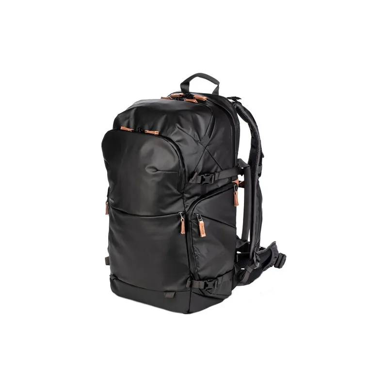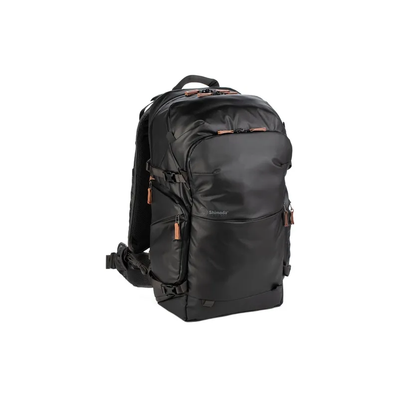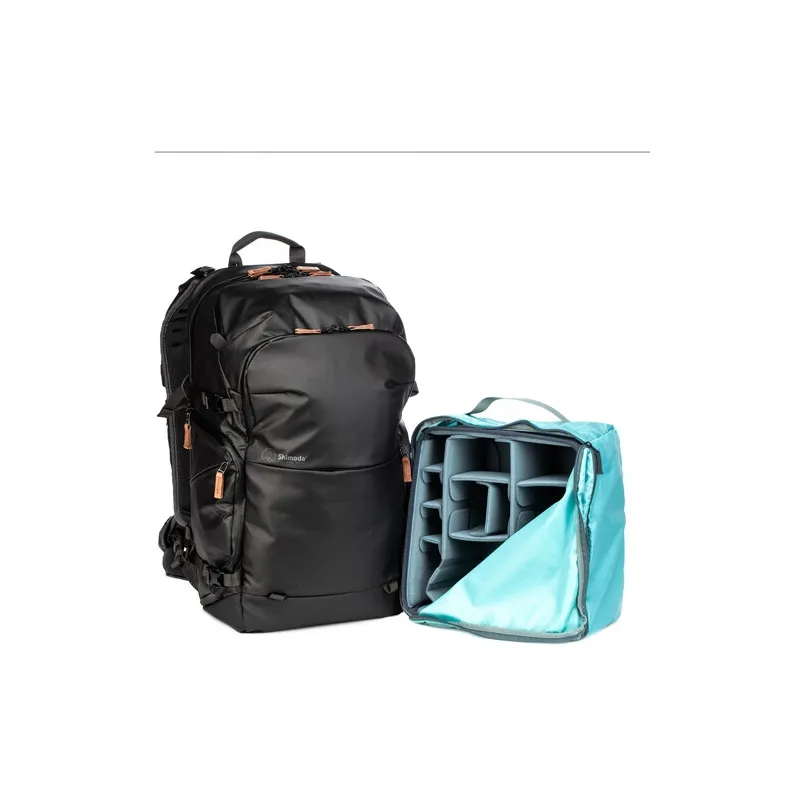 Shimoda Designs melnais Explore v2 35 mugursomas foto starta komplekts ir lielākais modelis no to vadošās fotoaparātu mugursomu līnijas, un šajā komplektā ietilpst vidēja izmēra Core Unit, kas paredzēts tādām kamerām kā Fuji X-T4 un Sony a7 sērijas kamerām, taču tajā var ievietot arī Canon 5D vai līdzīga izmēra kameru. Šī daudzpusīgā, daudzfunkcionālā soma var apmierināt ceļojoša fotogrāfa, multimediju veidotāja, pārgājēja vai piedzīvojumu pasaules apceļotāja kombinētās prasības. Papildus somas funkcionalitātes funkcijām Shimoda pārveidoja siksnu sistēmu tā, lai to varētu pielāgot jebkuram lietotājam - tostarp iespēju nomainīt mugursomas siksnas ar papildu siksnām, lai vēl vairāk pielāgotu ērtības.
