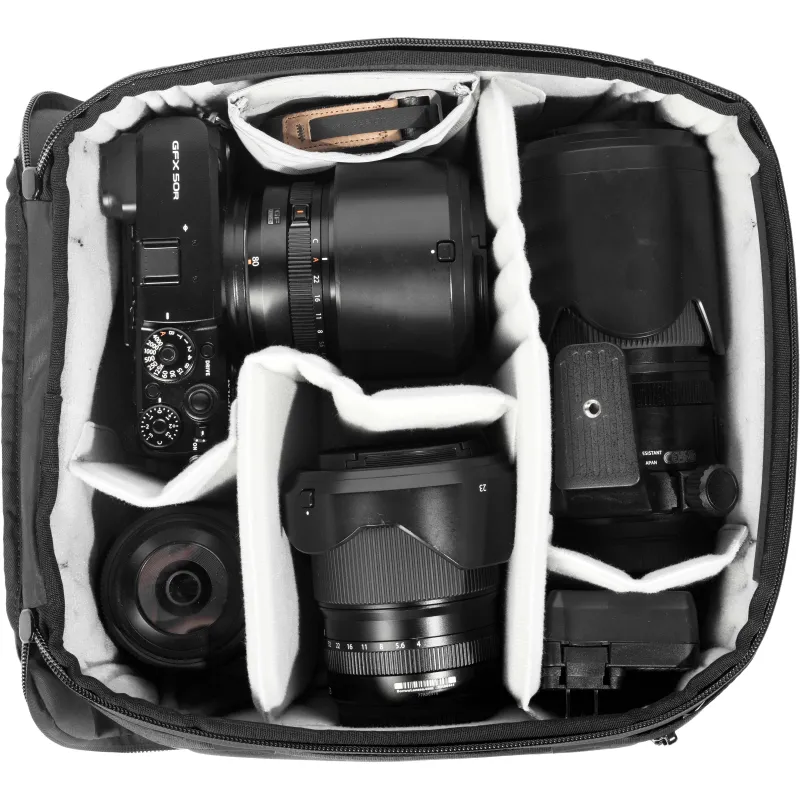 FlexFold dividers enable customizable organization and protection. Vertically stack items for maximal capacity. Floating pocket stores lens caps, filters, and other small items.