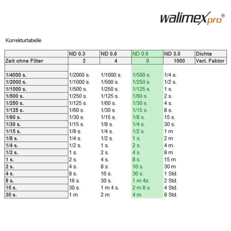 The neutral-density filter from walimex pro extends the exposure time by 3 apertures (factor 8), which enables you to achieve e.g. motion blurring and flow effects (e.g. on waterfalls). It is therefore mainly used in landscape photography. It also ensures uniform darkening of the image and reduces the light quantity, in order to achieve less focal depth with open aperture.