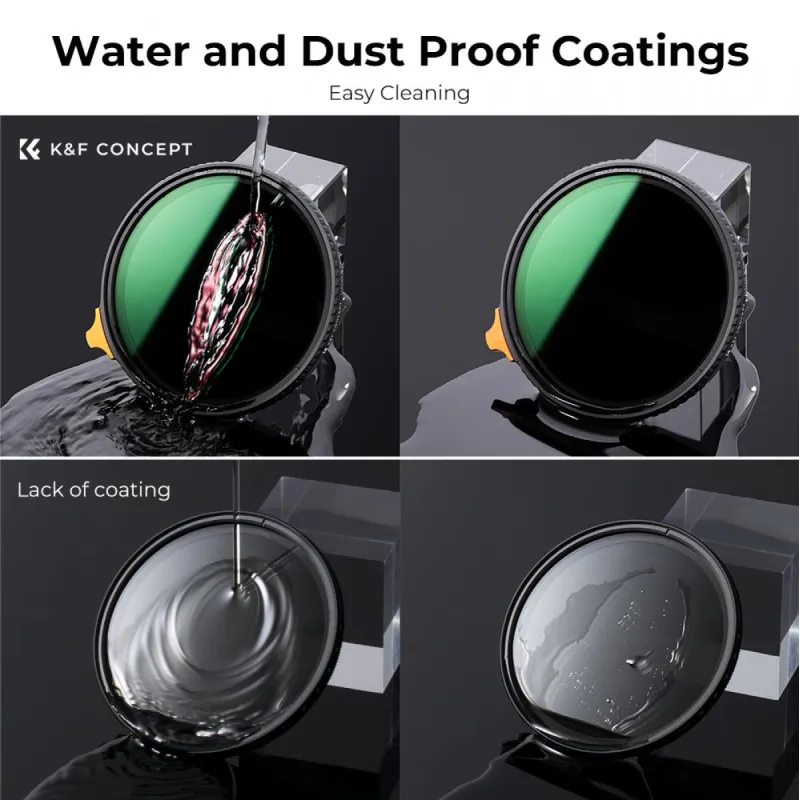Elevate your photography with this versatile 2-in-1 filter by K&F Concept, featuring both ND2-400 and Black Mist 1/4 functions. This innovative filter serves as a light filter or a black mist filter, offering flexibility in achieving your desired photographic effects. The slim, CNC-designed frame ensures easy installation and removal, with an aviation-grade aluminum build and a thin 7.4mm frame that eliminates vignetting at wide-angle and telephoto settings. With top optical glass and double-sided 28-layer anti-reflection coating, this filter achieves an impressive 84% transmittance for superior image quality. Offering 9 stops of infinitely adjustable dimming, it allows you to precisely control the amount of light entering. Plus, the glass is coated to resist mildew, water, scratches, and oil, ensuring your lens stays clean and your images remain sharp and clear. Elevate your photography game with K&F Concepts advanced filter.