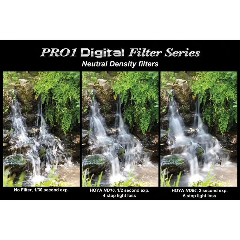 The 58mm 58mm Pro 1 Digital Neutral Density 64x Filter from Hoya is an ultra thin filter that permits you to shoot and create images that would not ordinarily be possible to capture. This filter effectively reduces your ISO by 1/64 (6 stops).This means that a shot normally taken at 1/500 sec @ f/11 can be shot at f/11 at 1/8th second. Designed with the outdoor shooter in mind, this filter helps reduce the amount of light entering the lens. This translates into the use of wider apertures and, thereby, permits the photographer to have more control over his depth of field. This is especially useful when shooting outdoor portraits when you wish to establish more of a separation between subject and background. The result will be a sharp, clear subject with a soft background. The ultimate value of this filter is its ability to allow you to use high speed ISOs under bright light conditions.