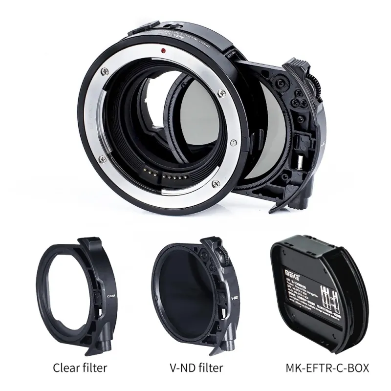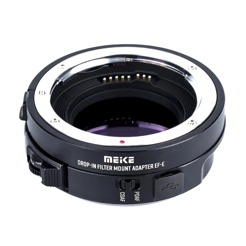 Drop-in filtra stiprinājuma adapteris ļauj piestiprināt EF/EF-S objektīvus Sony E mount kamerai un mainīt nolaižamo filtru. Atbalsta AF (PDAF un CDAF režīmus).