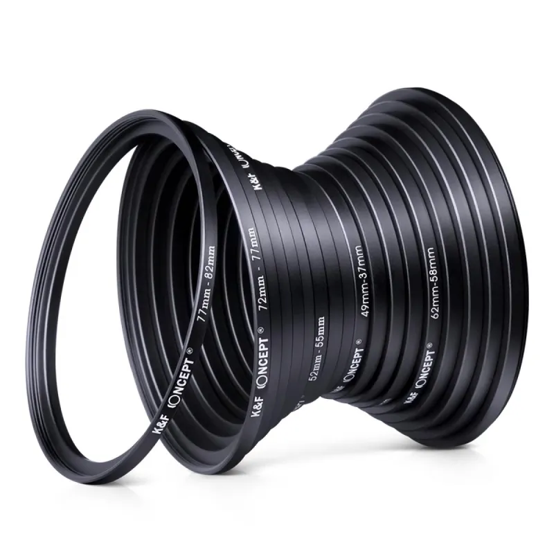 18 in 1 Lens Filter Ring Adapter All in One Kit. Include Step Up Filter Adapter Ring Kit(37-49, 49-52, 52-55, 55-58, 58-62, 62-67,67-72, 72-77, 77-82mm). Include Step Down Filter Adapter Ring Kit(49-37, 52-49, 58-55, 55-52, 62-58, 67-62,72-67, 77-72, 82-77mm).