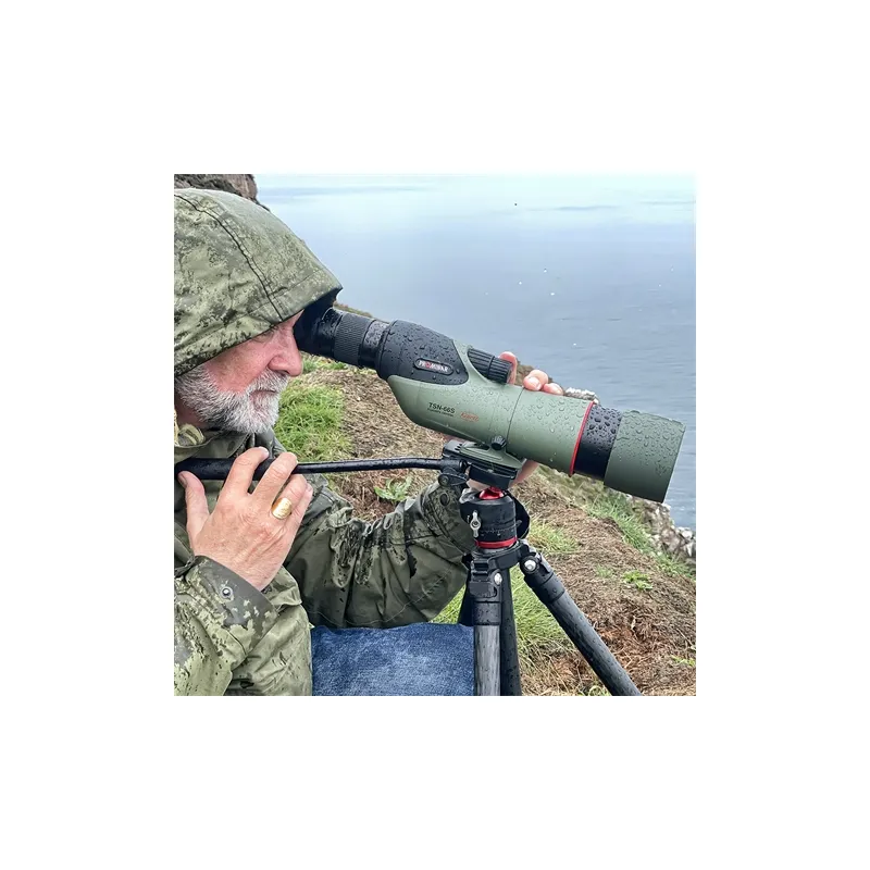 When looking through the spotting scope for long periods, it is wise to use a tripod. A tripod allows you to fully focus on the subject. The Kowa TSN66S spotting scope is equipped with both 1/4" and 3/8" threaded connections. However, it is important to buy a tripod that has the right height and perhaps choose one with a fluid-damped head. A tripod with a fluid-cushioned head moves more fluidly and prevents the spotting scope from overshooting once you have the subject in focus.