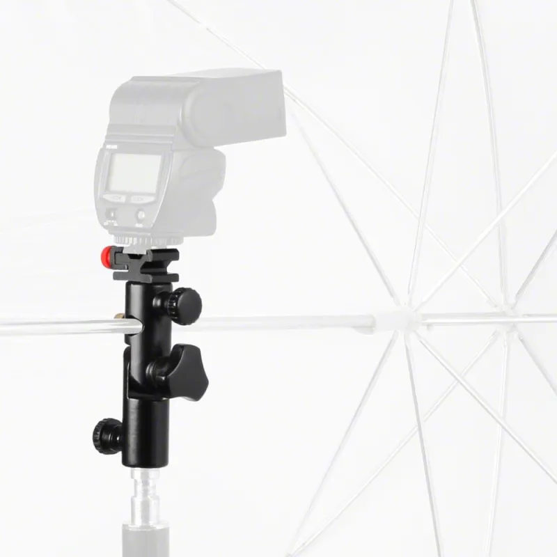 Izturīgs metāla sakausējums foto kameru zibspuldzes un lietussarga stiprināšanai. Maināma pozīcija no - 90° līdz +90°. Turētāja karstās pēdas adapteris ir noskrūvējams. Fiksēšanas mehānisms notur lielu svaru. Saderīgs ar visām zibspuldzēm, kurām ir standarta karstās pēdas izmērs (izņemot Monolta/Sony).