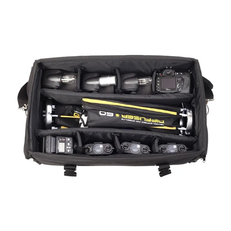 The SMDV Carrying Bag is a spacious, sturdy carrying bag for transporting your studio equipment. Ideal for the SMDV Briht-360 Studio Flash and multiple accessories. The top of the bag has mounting options for 4 tripods.