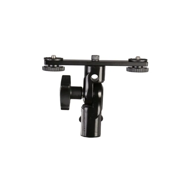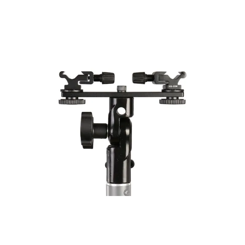 Falcon Eyes Twin Mount Tilting Bracket CLD-14A ir aprīkots ar diviem karstās hot shoe adapteriem HS-20M, uz kuriem var uzstādīt piederumus, piemēram, kameras zibspuldzi. Ja atskrūvējat hot shoe adapterus, uz nolieces kronšteina ar 1/4 savienojumu varat piestiprināt arī citus piederumus.