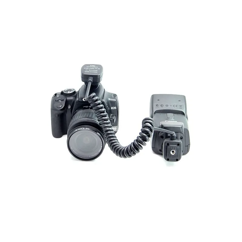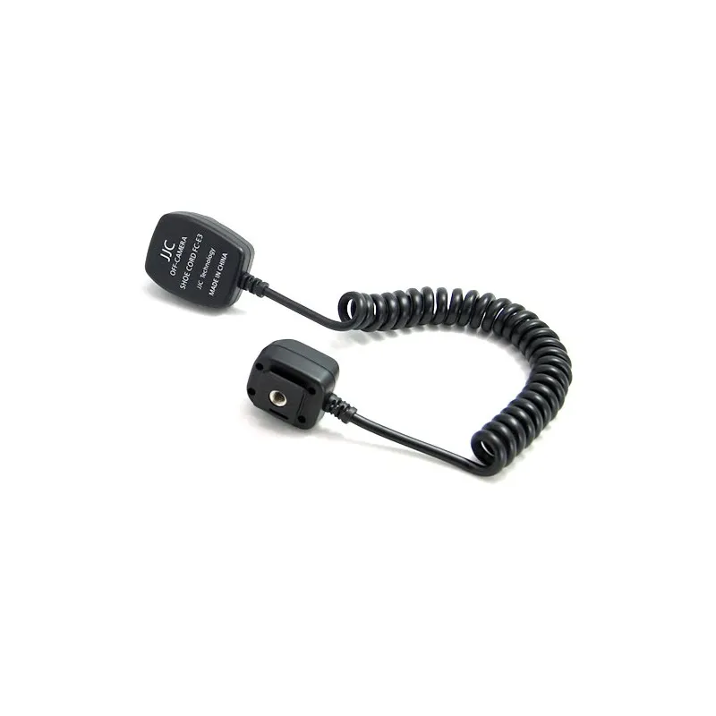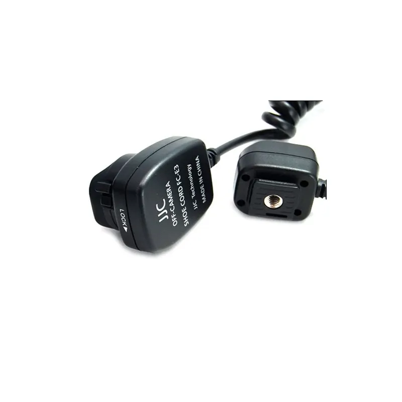 JJC FC-E3 ārpus kameras bākugunis JJC FC-E3 Off-Camera Shoe Cord var piestiprināt pie Canon kameras hotshoe savienotāja un ar otru galu piestiprināt zem zibspuldzes. Šis ērtais un lētais kabelis ļauj izmantot zibspuldzi atsevišķi no kameras līdz 90 cm attālumam. Ir pieejams arī 1/4" vītņsavienojums.