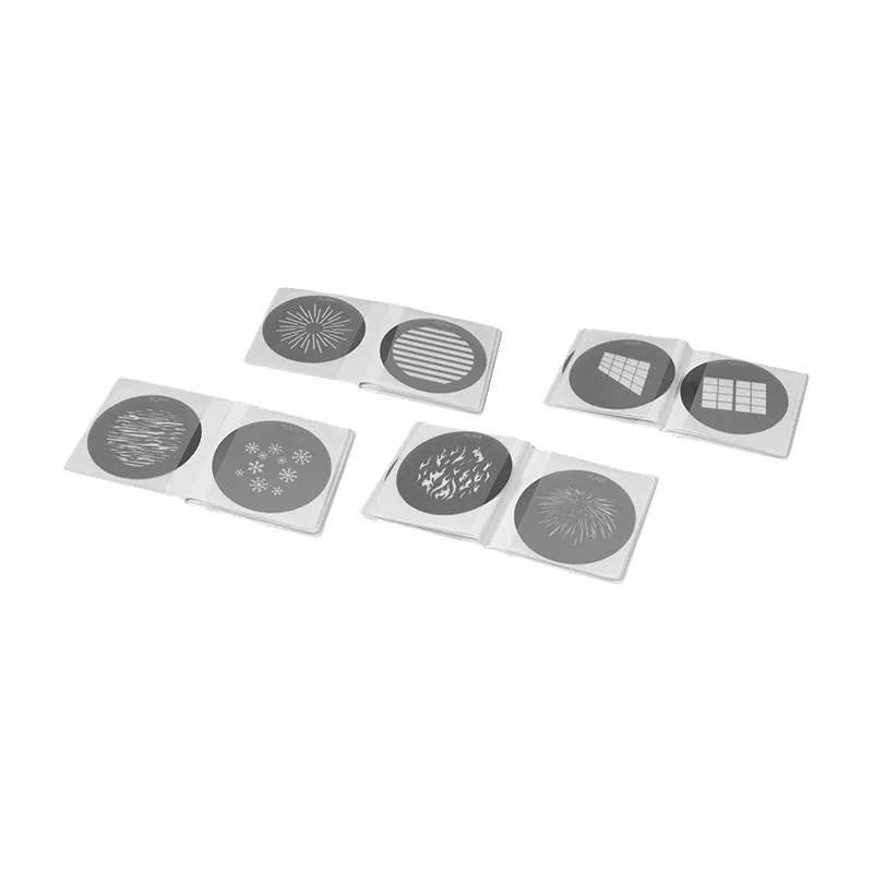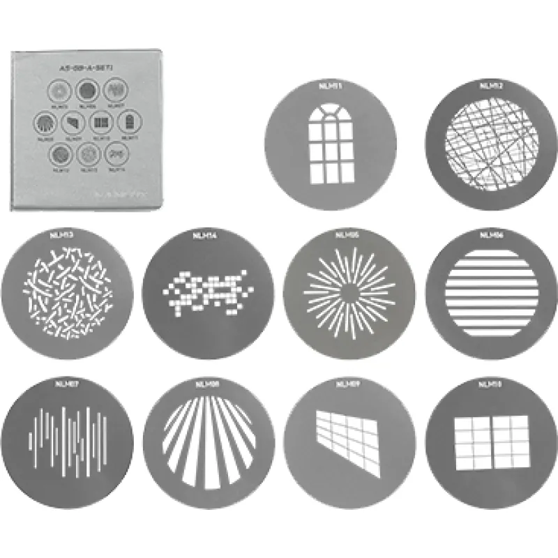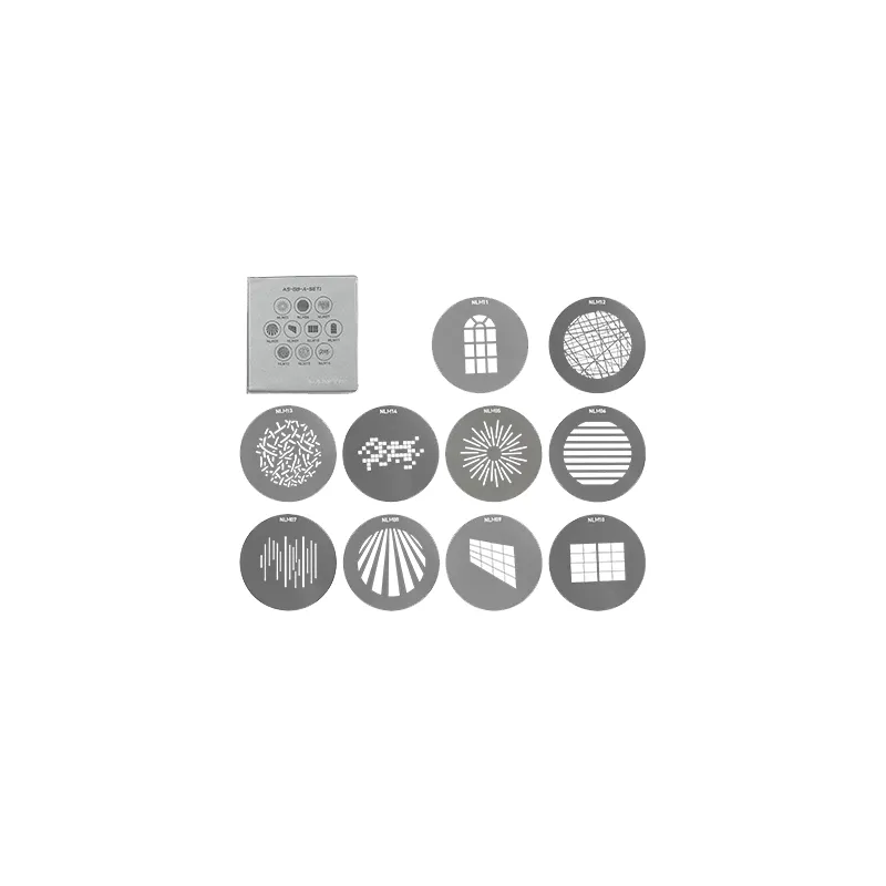Katrs gobo ir izstrādāts ar unikālu rakstu, kas atšķiras no tiem, kas ir SET 2. Katru gobo var ievietot gobo turētājā, kuru pēc tam var uzstādīt uz NL montāžas projektora piederuma 15-30. Šis iestatījums nodrošina radošu apgaismojumu un pievieno vizuālu dziļumu jūsu projektiem.