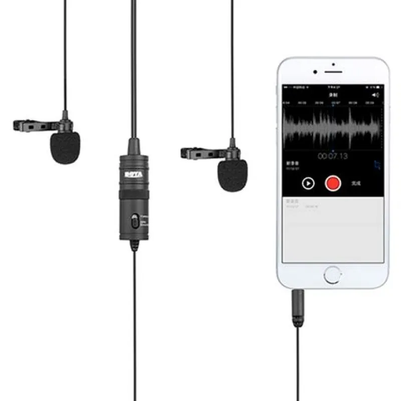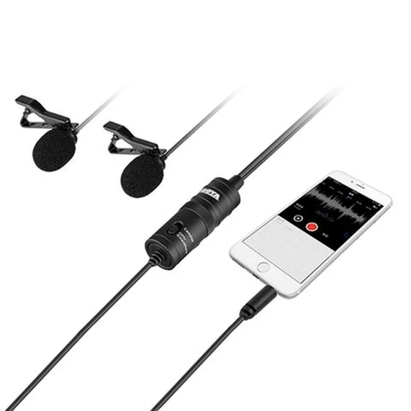 Boya BY-M1DM ir Dual Lavalier universāls mikrofons ar vienu 1/8" stereo savienotāju, to var izmantot ar viedtālruņiem,