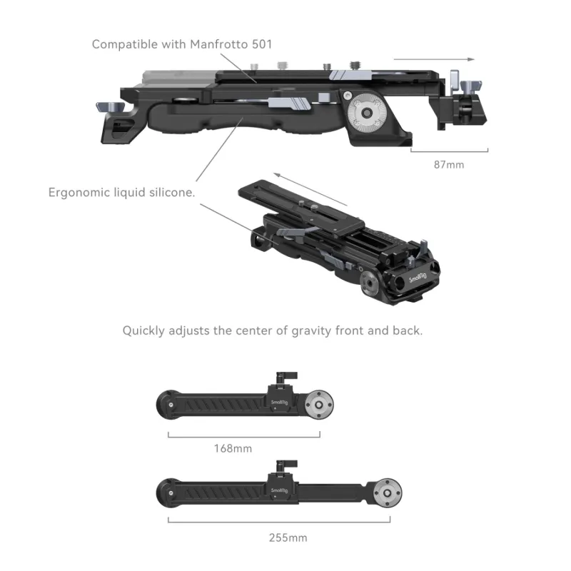 Komplektā iekļautajā Manfrotto 501 plāksnē ir mērījumu atzīmes, un tā slīd uz priekšu un atpakaļ 3,1" diapazonā, lai līdzsvarotu kameru uz pleca vai statīva. Priekšējo 15 mm stieņa skavu var regulēt vertikāli 1,1", lai nodrošinātu atbilstošu 15 mm stieņa augstumu noteiktām kinokamerām. Manfrotto plāksnei ir 1/4"-20 un 3/8"-16 kameras montāžas skrūves un plakana uzgriežņu atslēga, kas atrodas zem pamatplāksnes un nostiprina kameras skrūves.