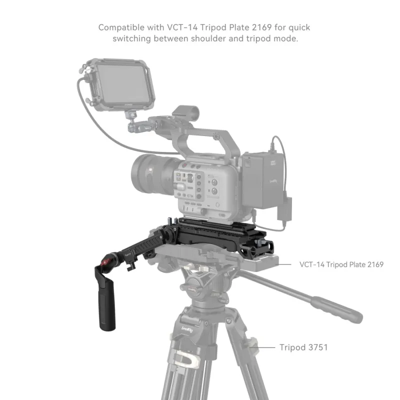 SmallRig Shoulder Rig Pro komplektā ir visi nepieciešamie rīki ērtai un intuitīvai filmēšanai ar Sony, Blackmagic, Canon vai Panasonic kinokameru, kas tiek uzstādīta uz pleca. Komplektā ietilpst plecu spilvens ar saderību ar VCT-14 statīva plāksni, divi regulējami pagarinātāji un divi gumijoti rokturi ar ARRI rozetēm. Pēc salikšanas statīvs ir saderīgs ar 15 mm LWS stieņiem un ātrās atbrīvošanas sistēmām, lai efektīvi pārietu no filmēšanas no rokas uz filmēšanu ar statīvu.