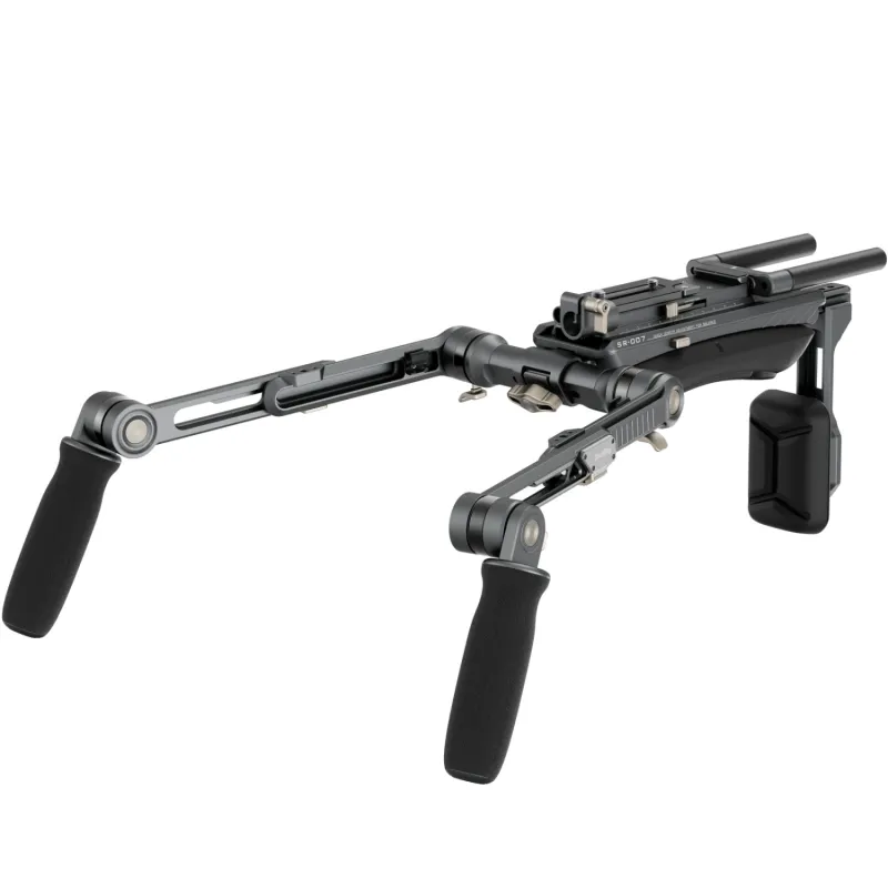 Ar divu-in-vienā montāžas plāksni tas atbalsta divvirzienu slīdēšanu un plašas smaguma centra pielāgošanas iespējas. Rokturi var noņemt, lai uzstādītu citus aksesuārus, un iebūvētās 1/4-20 skrūves caurumi paplašināšanas rokās ļauj pievienot monitorus. Iekļautas kabeli turētāji, lai viss būtu kārtībā.