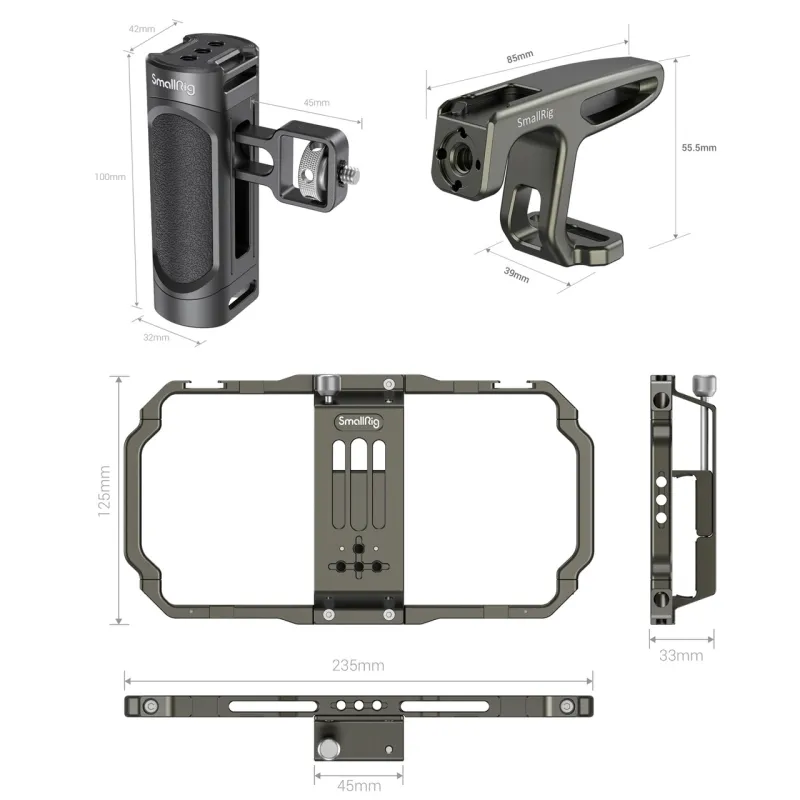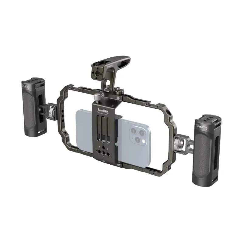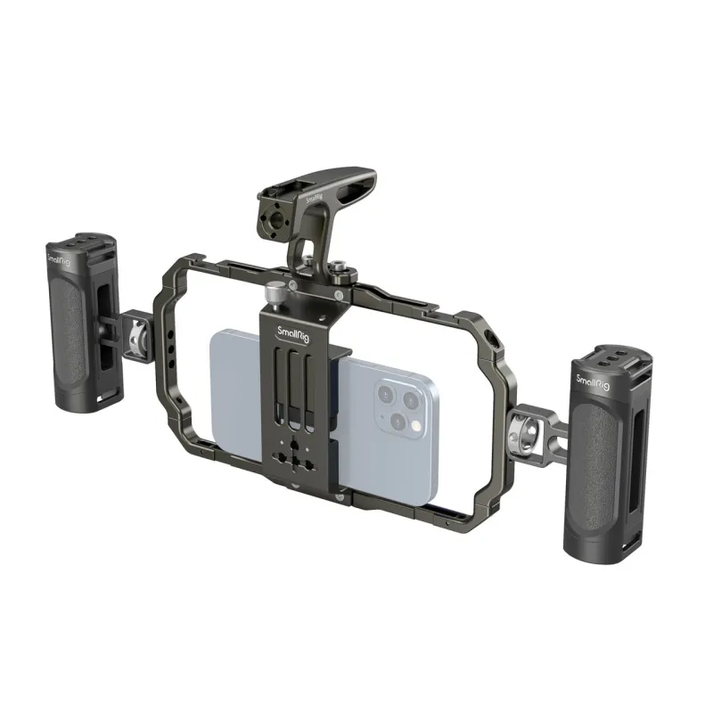 The SmallRig 3155 Universal Mobile Phone Handheld Video Rig Kit is a perfect mobile phone video rig for vlogging, mobile filmmaking, commercials, etc. Its compatible with mobile phones with a width range from 62mm to 86mm, with or without a case. The kit comes with two side handles and a top handle for a more stable handheld phone shooting. It features two cold shoe mounts and multiple 1/4 threaded holes to attach accessories like a microphone, a LED light, a tripod, etc.