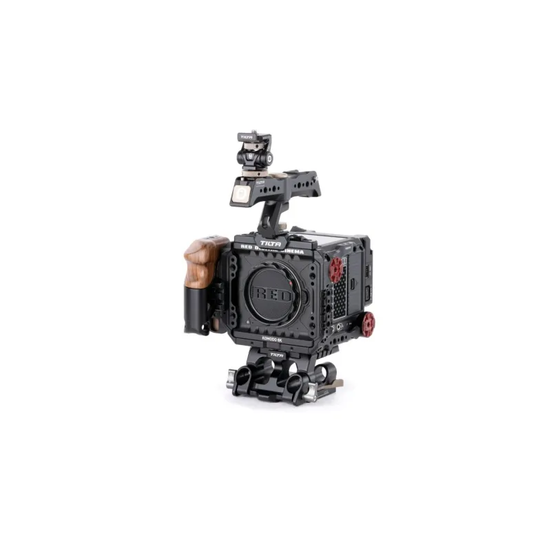 This camera cage provides protective armor for the RED Komodo camera. It provides several 1/4-20 and 3/8-16 mounting points for mounting accessories.