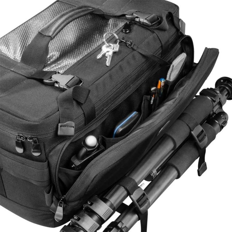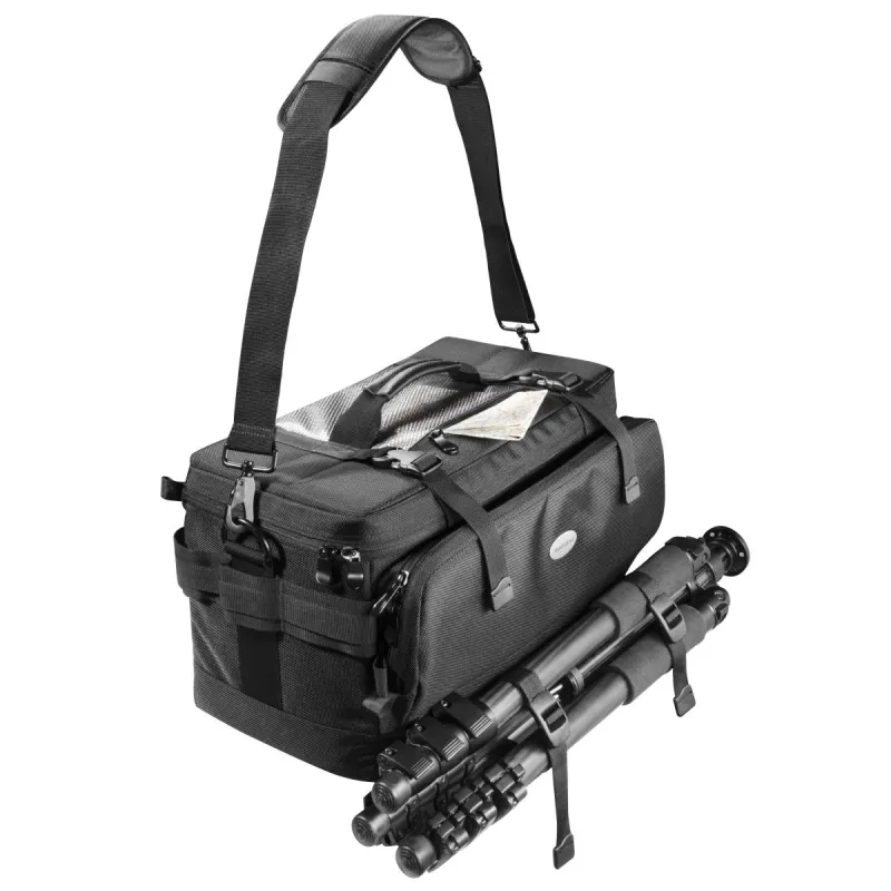 Ar 6 Velcro piestiprinātiem atdalīšanas spilveniem jūs varat var individuāli pielāgot somas iekšpusi, lai tas atbilstu jūsu aprīkojumam. Somas sienas ir polsterētas ar biezu putuplasta gumijas slāni un tādējādi spēj absorbēt pat smagus triecienus. Nodalījums priekšpusē un nodalījums uz somas vāka nodrošina optimālu ietilpību turpmākiem piederumiem vai personīgajiem priekšmetiem. Dokumentu nodalījums aizmugurē nodrošina vietu drošai dokumentu glabāšanai.