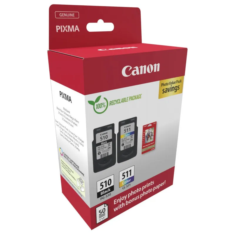 Šī daudzpakete ir izdevīgs risinājums ilgnoturīgām izdrukām. Tajā ietilpst PG-510 9 ml melnās tintes kasetne, kas paredzēta 220 A4 formāta dokumentu drukāšanai, un 9 ml CL-511 krāsu tintes kasetne, kas paredzēta 244 lappušu drukāšanai spilgtās krāsās. Oriģinālā Canon tinte nodrošina labāku kvalitāti un uzticamus rezultātus, tāpēc varat drukāt vairāk par mazākiem līdzekļiem.
