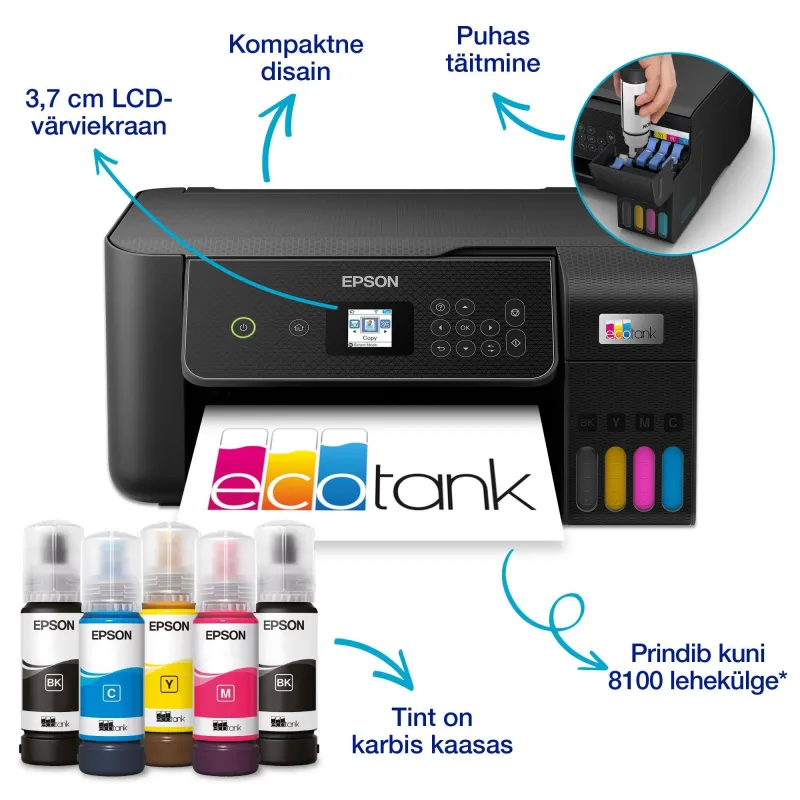EcoTank nodrošina bezrūpīgu drukāšanu mājās - īpaši lielas ietilpības tintes tvertnes ļauj bez netīrumiem uzpildīt tinti, un pudeles ar atslēgu bloķēšanas sistēmu ir veidotas tā, ka var ievietot tikai pareizo krāsu. Priekšpusē esošais tintes līmeņa displejs nozīmē, ka ir viegli redzēt, kad beidzot ir pienācis laiks to papildināt.