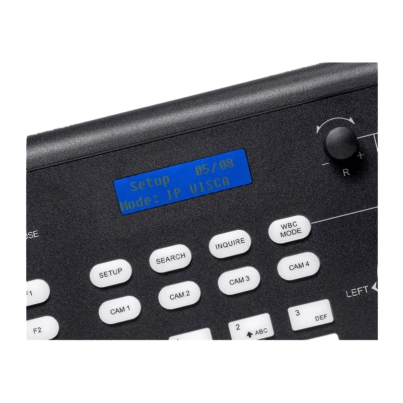 The control panel features a 4D joystick, camera selection buttons, a zoom rocker, focus, iris, and speed knobs, and an LCD status display. There are even programmable buttons to assign user shortcuts. The controller can be powered via the included power adapter or over PoE on a supported network.