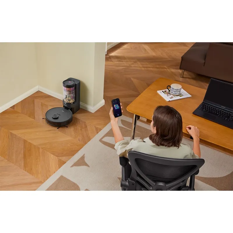 Inovatīvā pacelšanas rokturis atvieglo pašiztukšojošās bāzes pārvadāšanu, un uzlabotā malas tīrīšanas funkcija rūpējas par grūti sasniedzamām vietām, piemēram, stūriem un vietām pie grīdas. Ar lietotni varat ātri un viegli pielāgot robota iestatījumus atbilstoši savām vajadzībām, saņemot paziņojumus, kad ūdens līmenis ir zems vai putekļu tvertne ir pilna.