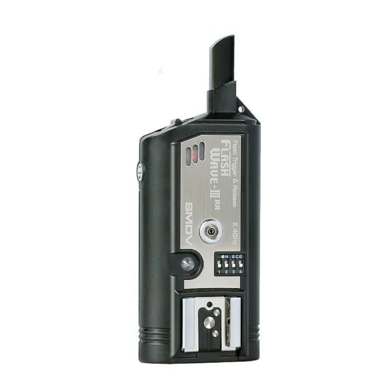 The SMDV FlashWave-III Digital Radio Slave Receiver is a separate receiver for use with the SMDV Flash Wave-III Digital Radio Slave trigger. The receiver can be used to trigger speedlites or studio flash heads from a distance. The receiver runs on 2.4GHz and features 16 channels.