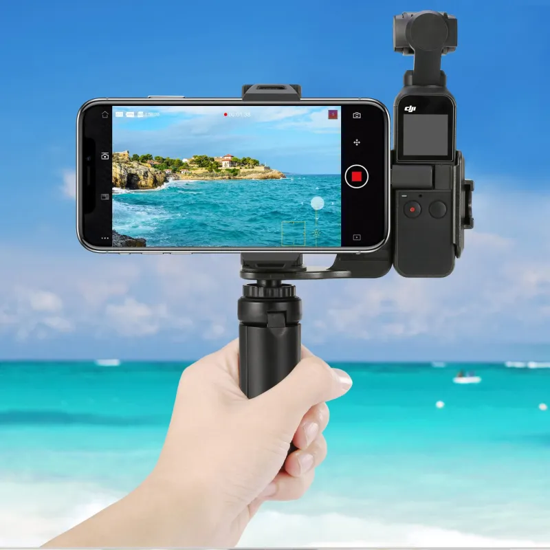 The Caruba Osmo Pocket Phone Holder Set ABS (incl table tripod) provides a better and more stable connection between your smartphone and your DJI Osmo Pocket or Pocket 2. In addition, the smartphone holder features a 1/4"- and cold shoe connection yo mount extra accessories such as a LED light or microphone. The holder includes a table tripod.