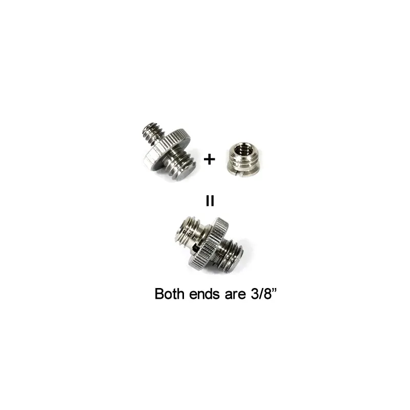 Thread Adapter with female 1/4" thread to male 3/8" thread. It works with our Double Head Stud w/ 1/4" to 3/8" thread, and make it work as a Double head stud w/ 3/8" to 3/8" thread. Includes: 5x New Thread Adapter w/ 1/4" to 3/8" thread Meterial:Stainless Steel Net Weight: 8g Package Size: 105x70x4mm Package Weight: 9g Notes:Not includes the Double head stud.
