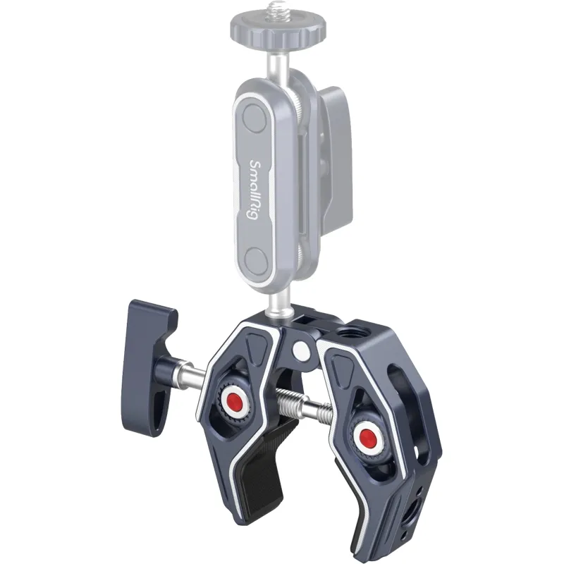 SmallRig Crab-Shaped Clamp 3755 is made of aircraft-grade aluminum alloy and stainless steel, CNC machined and carved to increase sturdiness and durability. It features a skeletal design and shark clamp with stronger clamping force as well as widely compatible 1/4"-20 threaded holes, 3/8"-16 threaded holes, and ARRI 3/8"-16 locating holes. The clamp, which supports a rod of a minimum diameter of 13mm and a surface with a maximum thickness of 65mm, can quickly attach cameras, monitors, LED lights, etc. to round pipes, cables, handlebars, tripods, and stabilizer handheld rings. In addition, built-in cushions provide protection and clamping stability.