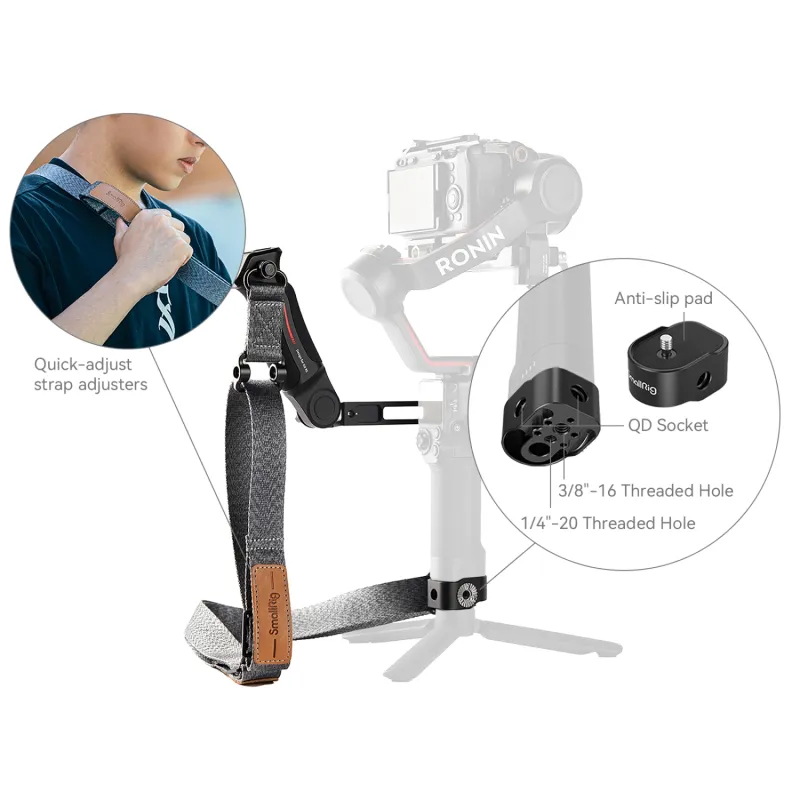 SmallRig Weight-Reducing Sling Handgrip Kit for DJI RS 3 / RS 3 Pro / RS 2 4383is specially designed for DJI RS 2 / RS 3 / RS 3 Pro. You just need to attach the baseplate to the bottom of a DJI gimbal via the 1/4-20 screw, sling the shoulder strap over your right shoulder, and then extend the gimbal tripod. When you shoot, simply pick up the gimbal; in static shot, it can release almost all stress on your arms. When you dont shoot, simply let go of the gimbal and sling it against your front or against your side like a shoulder bag, largely reducing the arms burden. The shoulder strap features QD mounts and sling swivels that enable easy accessory attachment and length adjustment. 1/4-20 and 3/8-16 threaded holes in the baseplate allow attaching tripods or other devices.The sling handgrip quickly secures the left side of a gimbal via the NATO clamp, which comes with an anti-drop design for added safety. Built-in 1/4-20 holes and ARRI 3/8-16 locating holes support Magic Arm2115C, Monitor Mount2903B; cold shoes on the top and side as well as NATO rail support Monitor Mount3026B, microphone, image transmitter, etc. Also, the handgrip can tilt0-180 degrees via a ratchet knob or act as a side handle to meet different needs; it is partly made of non-slip, anti-freeze silicone and aluminum alloy, ergonomically designed to hold comfortably. Overall, the delicate and compact kit works perfectly with gimbals.