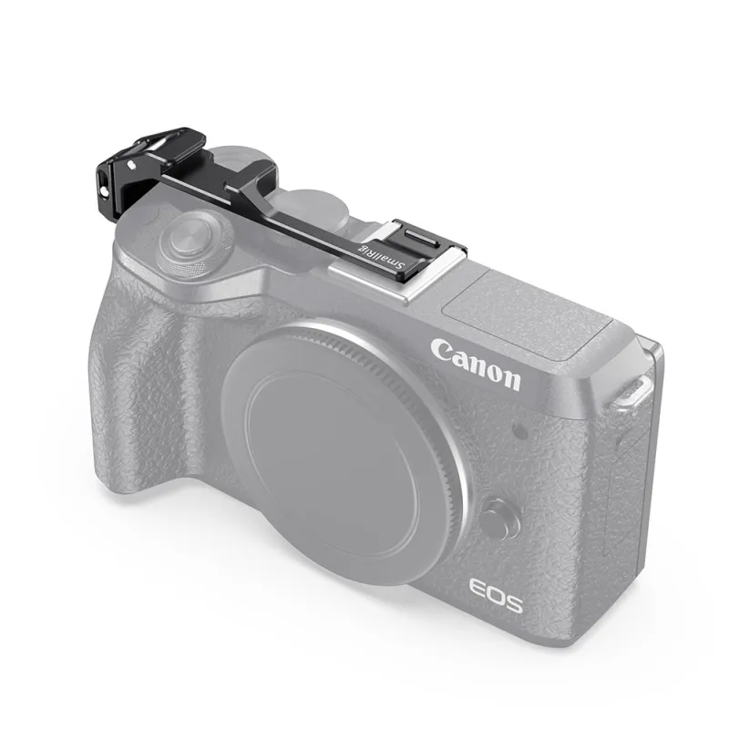SmallRig Vlogging Cold Shoe Relocation Plate for Canon EOS M6 Mark II BUC2627 pārvieto kameras bata stiprinājumu no kameras centra uz labo pusi. Pārvietojot kurpes stiprinājumu uz sāniem, piederumi netraucē atlokāmajam LCD ekrānam, kas ir īpaši noderīgi, ja fotografējat no kameras priekšpuses vlogošanas vai selfiju uzņemšanas nolūkā. Plāksni ievieto kameras kurpes stiprinājumā un labajā siksnas atverē, to nostiprinot ar M2,5 skrūvi. Tai ir arī gumijas spilventiņš, kas novērš nobrāzumus. Plāksne ir zema profila, un to var visu laiku turēt uz kameras, lai to varētu uzglabāt.