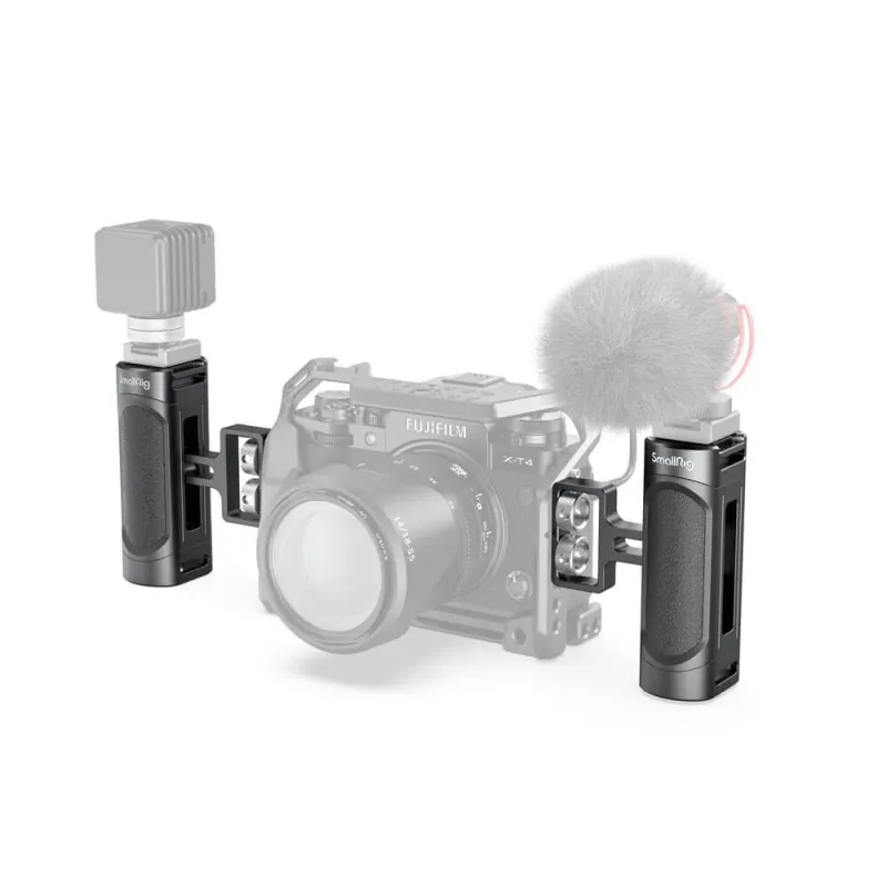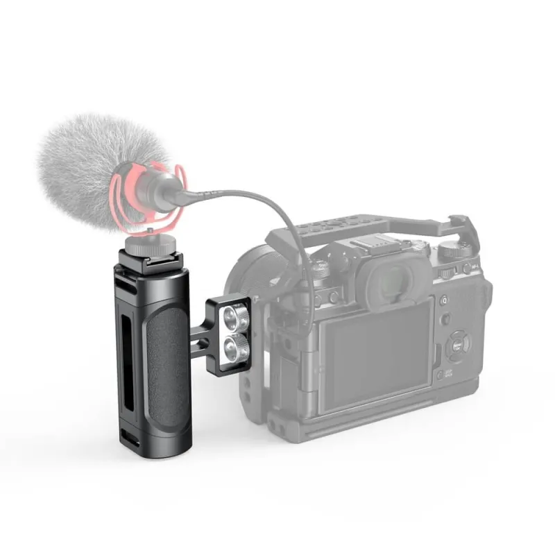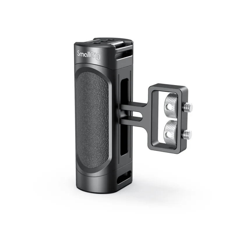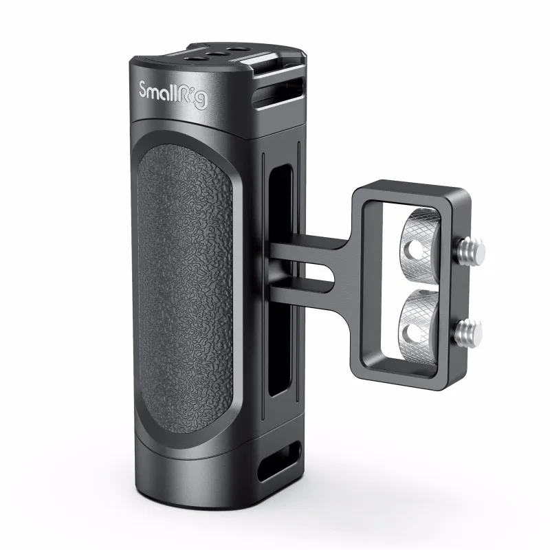 The SmallRig Mini Side Handle (1/4”-20 Screws) 2916 is designed for mirrorless, digital camera, and other small cameras. Two 1/4”-20 screws are fixed to the side of the Cage. The handle supports additional mounting options - The flash and microphone can be mounted through the cold shoe 1241, and the wrist strap, such as 2456, can be mounted through the eyelet to prevent the camera from accidentally falling off. Highly adjustable to fit different cage height and support the quick switch from left-handed to right-handed through the built-in wrench. Compatible with SmallRig Cages 2251, 2808, etc. Made of aluminum alloy and plastic(PC+ABS) with ergonomic design, the portable handle provides filmmakers with smooth and comfortable shooting experience.