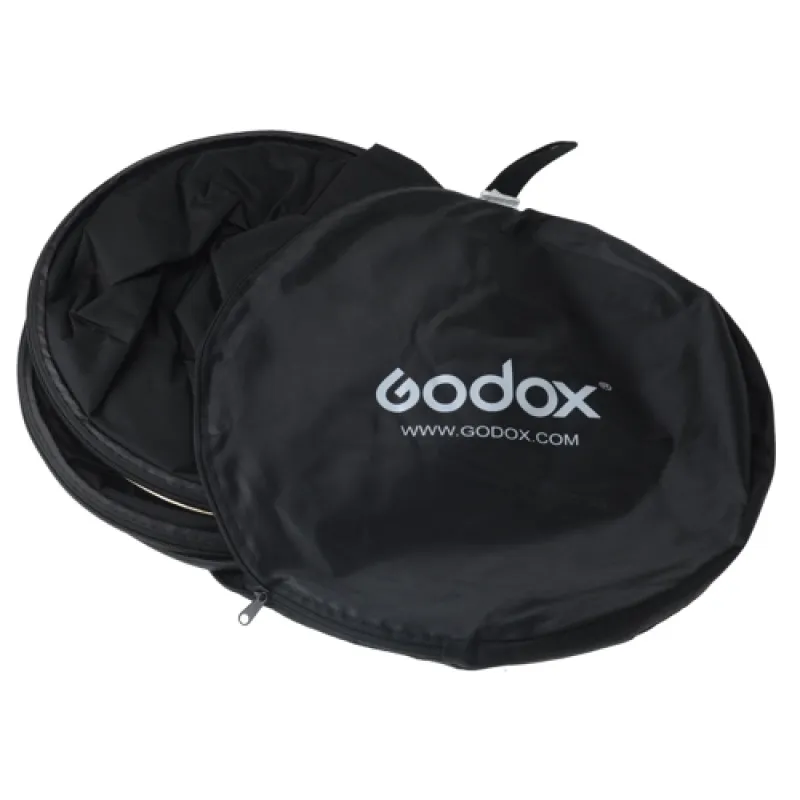 Handy bicolor reflector disc from Godox, in the colors gold and white. With the gold side you can 'heat' the color of the light and with the silver side the light can be hardened.