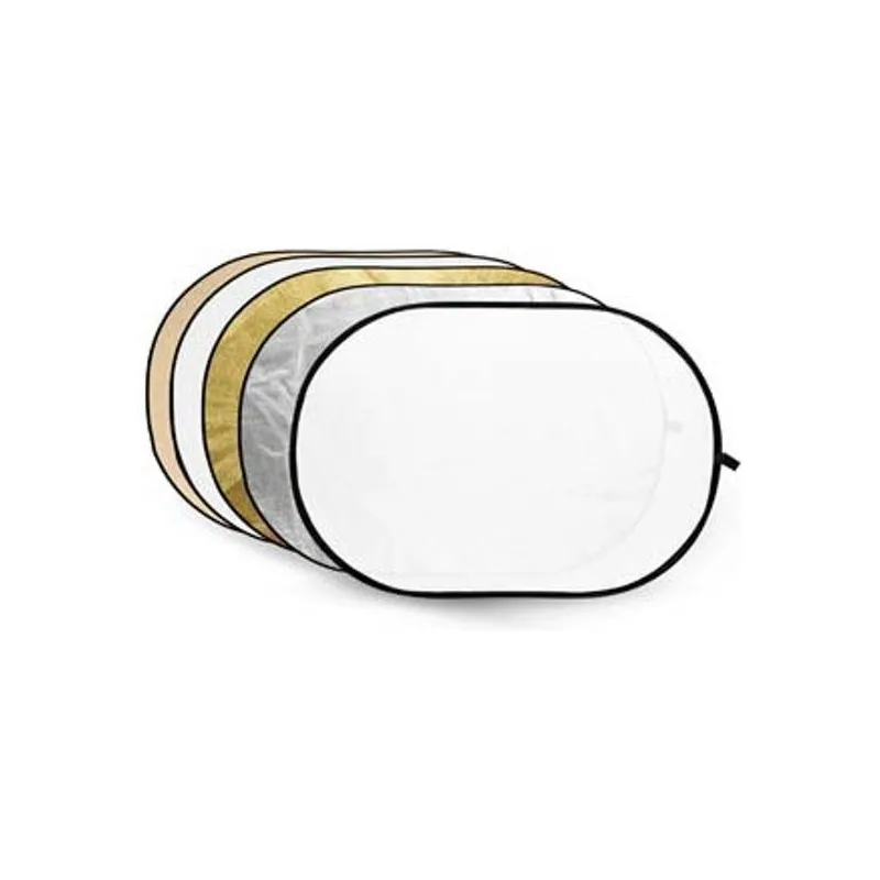 Caruba 5-in-1 zelta, sudraba, saulaini dzeltena, balta, caurspīdīga - 150 x 200 cm Šis Caruba 5-in-1 atstarojošais ekrāns ir ļoti universāls gaismas izkropļotājs, ko var izmantot gan filmēšanas laukumā, gan studijā. Būtībā šis ekrāns ir caurspīdīgs ekrāns ar 1 pieturas punktu. Pats ekrāns ir samērā viegli salokāms līdz 1/3 no izvērstā izmēra. Salocītu ekrānu var glabāt komplektā pievienotajā glabāšanas maisiņā.