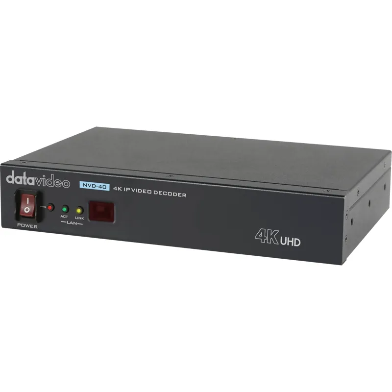 portDatavideo NVD-40 4K IP video dekodētājs ir universāls rīks darbam ar IP video, kas nodrošina līdz pat DCI 4K augstas izšķirtspējas produkcijai. Izmantojiet šo ierīci korporatīvajam video, dievnamiem un izglītības iestādēm. Dekodētājs ne tikai apstrādā abus 4K video veidus, bet tas to dara ar vienlaicīgi aktīvām visām izejām, lai jūs varētu vienlaicīgi izvadīt caur HDMI, kompozītvideo un RCA analogajām audio izejām.