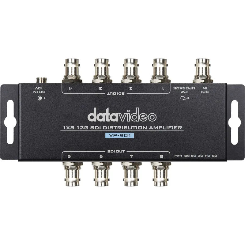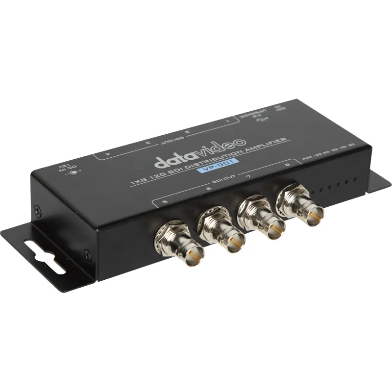 The VP-901 12G SDI Distribution Amplifier can distribute a single 12G, 4K, HD, or SD-SDI input into eight SDI outputs. It is a reliable video device, which splits an SDI, HD-SDI, 3G-SDI, 6G-SDI, or 12G-SDI video source to SDI compliant video displays simultaneously. It also supports re-clocking for a clean signal over long cable runs.