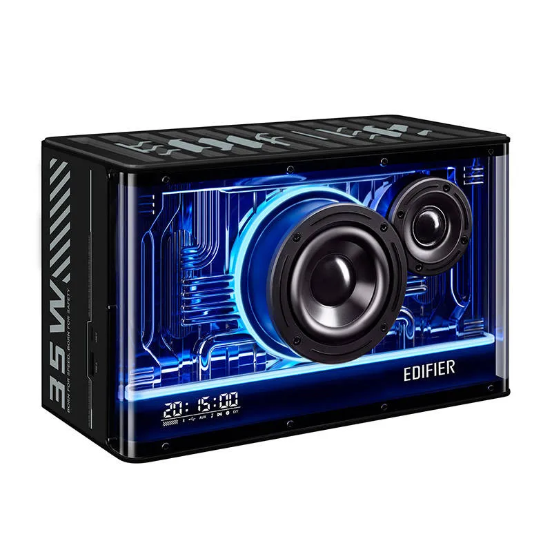 Skaļrunim ir krāsains fona apgaismojums un caurspīdīgs dizains, kas nodrošina satriecošus vizuālos efektus. Pielāgojiet fona apgaismojumu, izmantojot Edifier Connect lietotni, atbilstoši savām vēlmēm.