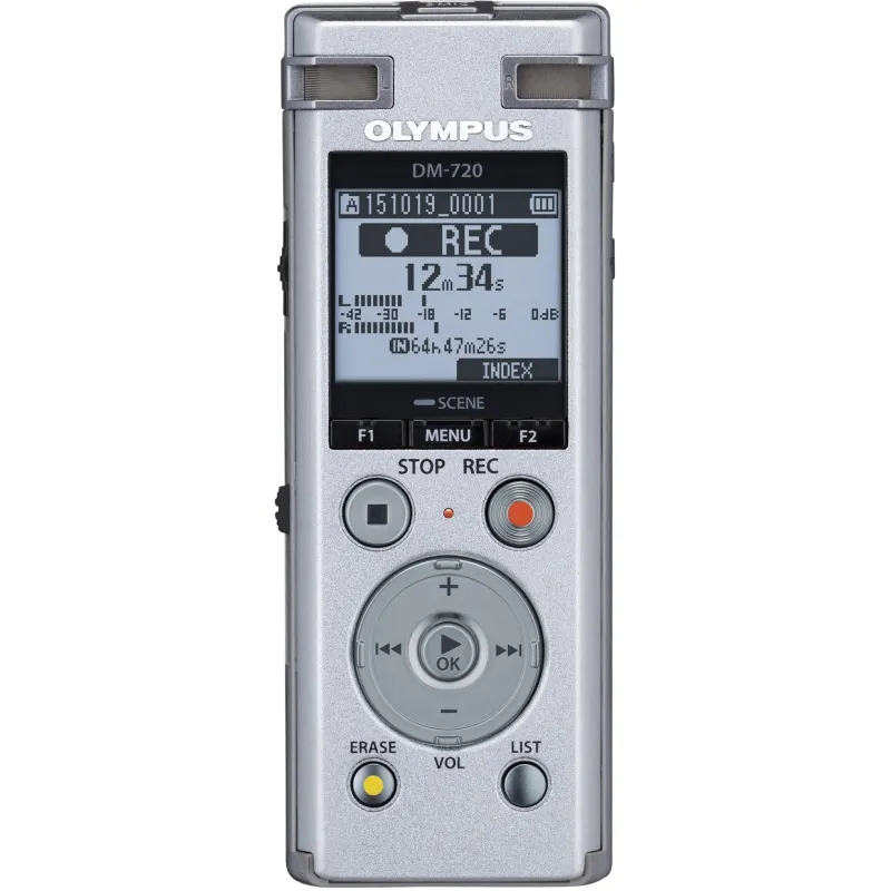 A feature unique to high-end OLYMPUS audio recorders is the advanced TRESMIC 3 microphone system – for the most accurate stereo sound capture possible. It uses two directional microphones for recording high-quality stereo sound, and a third omni-directional centre microphone that picks up the lower frequency bass sound. It increases the frequency response range to 20Hz–20kHz while achieving a natural stereo feeling.
