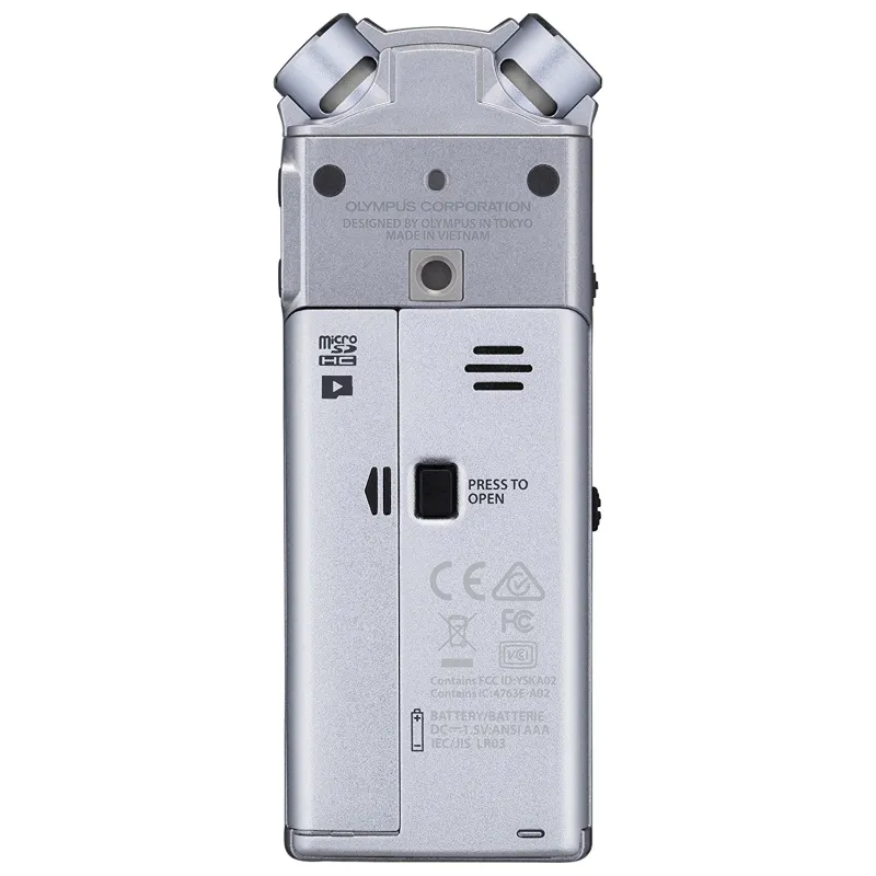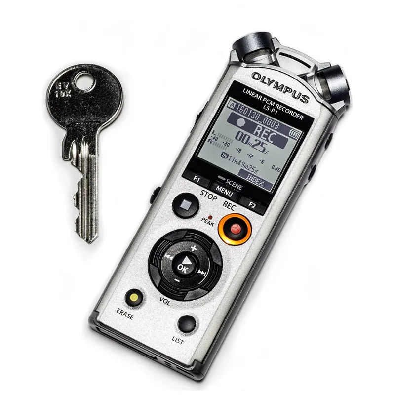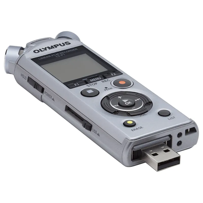 Get the most advanced microphones to date with the LS-P1 digital audio recorder: their 90° construction provides a great stereo feel. What’s more, the high quality of their build means you’ll enjoy clear sound with low noise. All of this and more is packed in a super-small body that gives you outstanding recordings – from music to meetings. With the LS-P1 pocket-sized PCM recorder, you have a stylish recording device that does not compromise on either high quality or the clear recording of all your songs – no matter what their genre. Ultra compact high resolution audio recording (96khz/24 bit sound) 90 natural stereo microphones Robust metal body with built in USB Up to 39 hour battery life (rechargeable battery included) Audio interface with USB microphone, manual recording and limiter Hi Res Audio Capture The LS-P1 supports linear PCM recording at bit rates up to 24 bits and sampling frequencies as high as 96 kHz – far surpassing the 44.1kHz/ 16 bits of CD-quality audio. Natural stereo sound with 90° outward-facing stereo mics The True Stereo Mic with two directional microphones positioned at a 90° layout, enables high quality recording with a realistic stereo feeling that can differentiate the position and the distance of the players on a stage. The recording is highly precise, letting you feel as if you are actually in the recording scene. Manual recording level settings The Manual Recording Level setting let you fine-tune the recording level to match the volume of your sound source, maximizing the dynamic range for high quality audio recording. This is a particularly important function when recording music. The Limiter function is effective for keeping volume below a specific level when using the Manual setting. By checking the recording level meter on the LCD display and PEAK display indicator, you can fine-tune your recording levels. Professional Level Amplifier Circuits Enjoy the most accurate stereo sound possible without any signal deterioration thanks to the high-quality microphone amplifier. It uses an advanced amplifier circuit to suppress interference – for original stereo sound audio recording from a compact device. OLYMPUS engineers have also gone even further to develop a new codec, so you have even clearer sound quality with less noise during AD/DA music conversion. Direct PC connection without a cable The built-in USB connector can be easily deployed and stored using the slide lever. With this feature, you can connect directly to a computer without using a cable or software. Not only can you save and share your recordings, the LS-P1 can also be recharged via USB without having to remove the battery (NiMH Included offering 39 hours battery life). The recorder can also be used as a USB memory device. Zoom microphone for recording from a distance With the latest directional quality control technologies, switching to directional microphone mode unleashes the power of proximity recording in noisy environments, such as at lectures or when recording from a distant position. You can adjust the directivity by operating with the "-" and "+" buttons. The new zoom microphone mode adjusts the recording level higher according to the zoom. Intelligent Auto Mode - Does the adjusting for you To make listening to your recordings more comfortable, the Intelligent Auto Mode adjusts the microphone sensitivity to match the volume of the sound source. When a speaker is talking loudly, the recorder reduces the input level, and for soft voices, the recorder increases the input level. In this way, the function automatically keeps track of the input level and simultaneously adjusts the recording level so that it always records at the best quality, providing an even level of volume