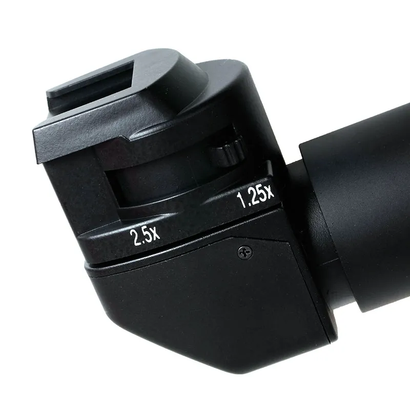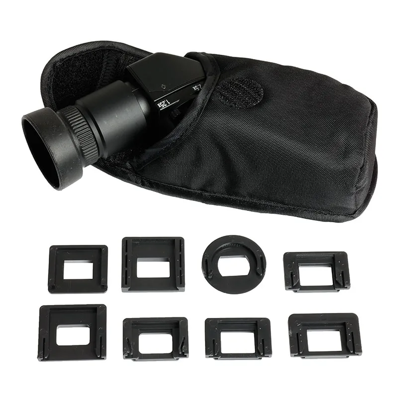 Skata leņķa skatu meklētāju var pagriezt par 360 grādiem, un palielinājumu var iestatīt 1,25 vai 2,5 reizes. Komplektā ir iekļauts ērts maisiņš Caruba leņķa skatu meklētāja glabāšanai. Lai skatu meklētāju varētu izmantot ar daudzu veidu kamerām, komplektā ir iekļauti adapteri Canon, Nikon, Olympus, Leica un Pentax zīmoliem.
