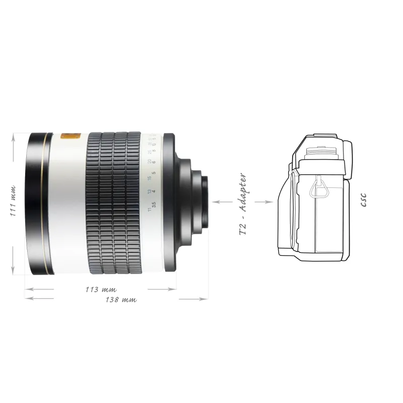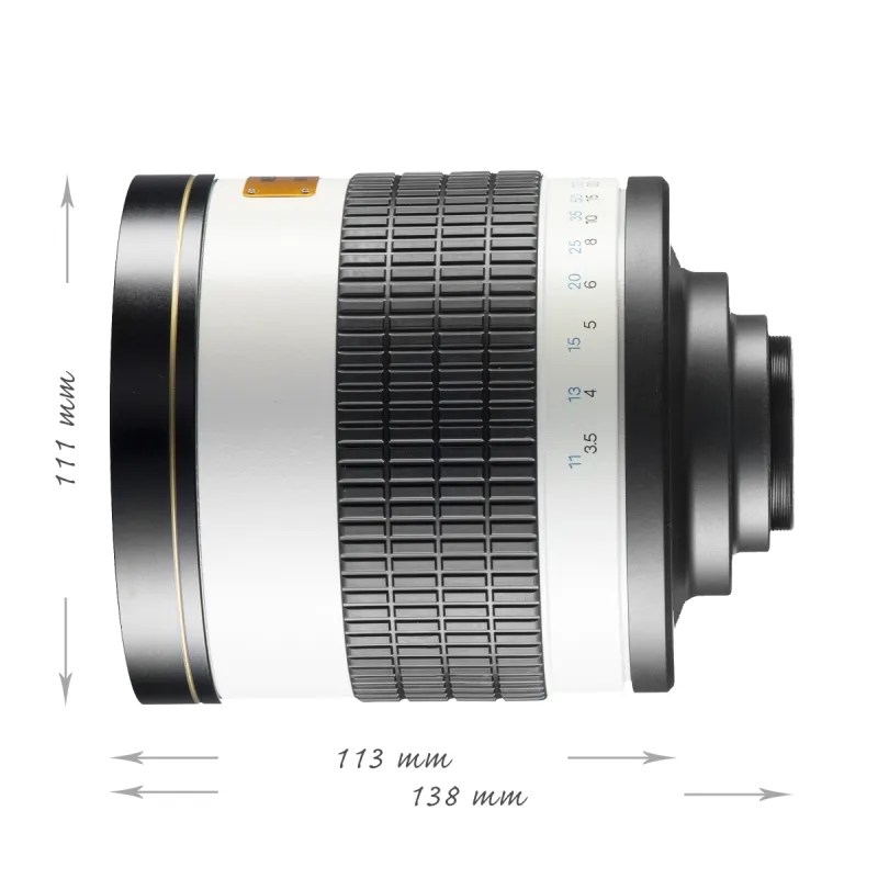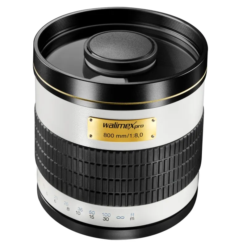 The walimex pro 800/8.0DX Mirror Tele Lens has a focal distance of 800mm and a good speed of 1:8.0. The sturdy metal housing and the high-quality workmanship and mechanics ensure a good image quality. With a very short closest focusing distance of only 2 metres, the lens enables a very good magnification. Focusing takes place manually. Thanks to the easy handling, the lens is also especially suitable for beginners.