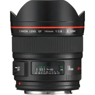 EF 14mm f/2.8L II USM ir ultra-platleņķa objektīvs, kas pārsniedz cilvēka perspektīvu. Tas uzņem līdz 114 grādiem diagonālā skatījumā, un koriģētā, taisnleņķa konstrukcija padara to par ideālu objektīvu interjeru, arhitektūras un ainavu fotogrāfijai, jo ultra-platleņķis nodrošina spēcīgu atdalīšanu starp priekšplānu un fona elementiem. Šis objektīvs ir daļa no profesionālās Canon L-sērijas flagmaņu klāsta, un tas ir izstrādāts izturīgai lietošanai un ir izturīgs pret putekļiem un mitrumu. Iebūvētais Ultra-Sonic Motors (USM) nodrošina ātru un klusu automātisko fokusēšanu ar iespēju pilnīgai manuālai kontrolei, un integrētā zieda formas objektīva aizsargājošā vāciņa konstrukcija novērš vignettēšanu.