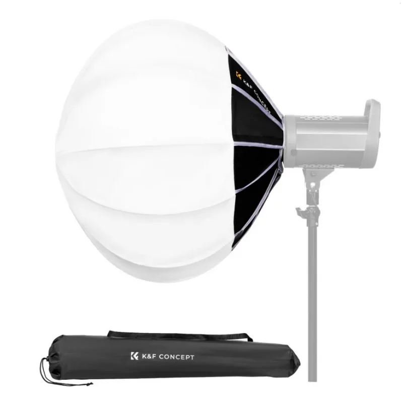 K&F 85CM Lantern Soft Light Box ir izstrādāts fotogrāfiem un filmu veidotājiem, kuriem nepieciešami daudzpusīgi un efektīvi apgaismojuma risinājumi. Tās sfēriskā forma nodrošina 360 grādu visvirzienu mīksto gaismu, padarot to ideāli piemērotu studijas lietošanai, vienmērīgi izkliedējot gaismu ar 270 grādu staru leņķi. Šis laternas softbox ir ideāls, lai radītu mīkstu, vienmērīgu apgaismojumu plašā teritorijā ar vienu gaismas avotu.
