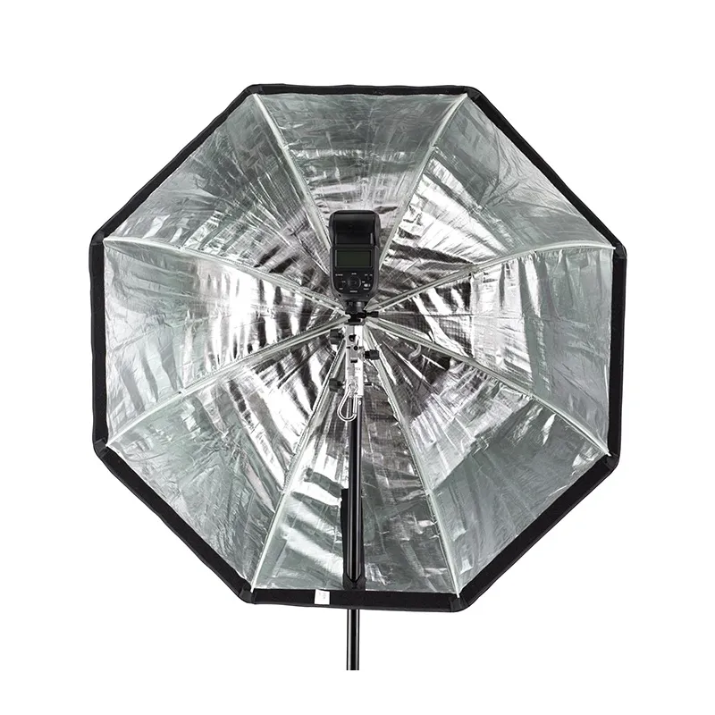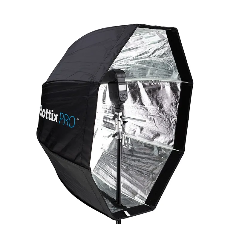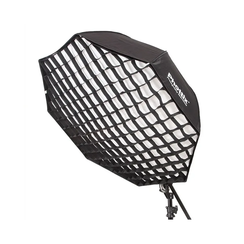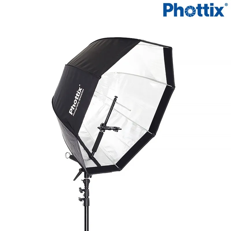 Easy Up HD Umbrella Octa Softbox ar Phottix režģi ir gaismas pārveidotājs ar diametru 32" un lielu virsmu, kas to padara iecienītu portretu un modes fotogrāfu vidū. softboxam ir sudraba iekšpuse maksimālai izvades jaudai un noņemams priekšējais difuzors, kas nosedz tā unikālo dizainu. tā vietā, lai zibspuldzes galva būtu vērsta uz priekšu no softboksa aizmugures, tā ir novietota softboksa iekšpusē un vērsta uz softboksa aizmuguri.