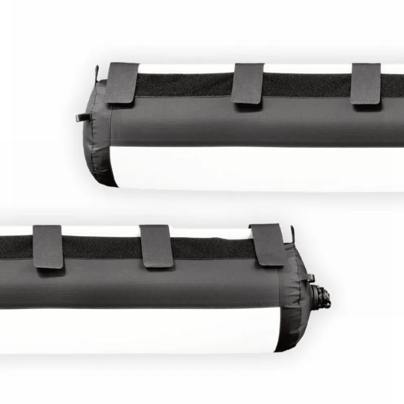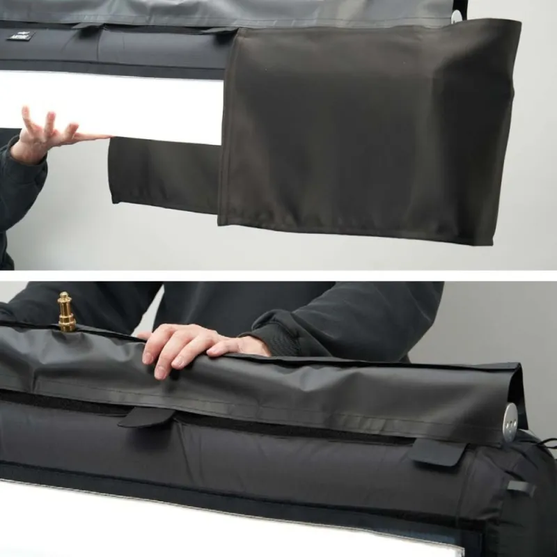 The Airtube Classic 240 is a softbox for tube lights with a length of 240cm. It is inflated like an air mattress and maintains its shape without any additional reinforcement. The diameter grows to 19cm. The beam angle is also increased many times over. This means you can evenly illuminate large areas with a similarly small tube light. The light itself is held securely in the softbox using Velcro straps. The light cone can be limited to the sides using curtains.