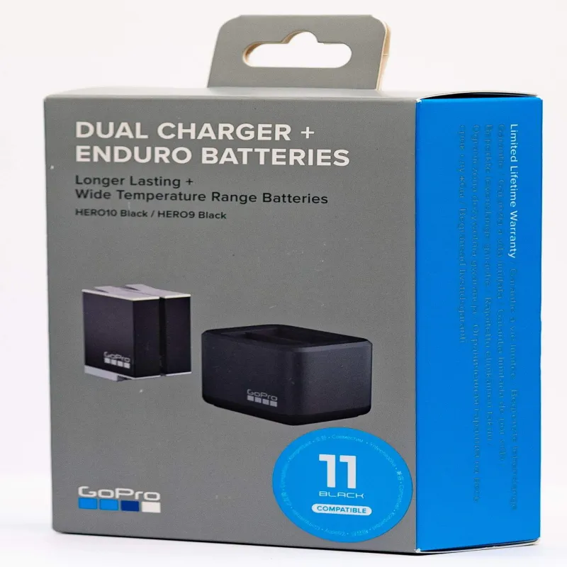 Uzlādējiet 2 akumulatorus vienlaicīgi ar GoPro lādētāju. Uzlādi var veikt no jebkuras USB pieslēgvietas. Uzlādes laikā LED indikatori norāda katra akumulatora enerģijas līmeni. Papildus lādētājam komplektā ietilpst arī divas Enduro baterijas kamerām HERO10 un HERO9 Black.