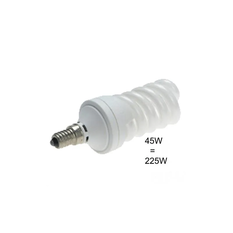 ;Šīs dienasgaismas spirālveida lampas jaudu var reizināt ar koeficientu 5, salīdzinot ar parasto spuldzi. Šīs 45 W spirālveida lampas jauda ir salīdzināma ar 225 W spuldzes jaudu. Lūdzu, ņemiet vērā, ka šīm lampām ir pieejamas dažādas kvalitātes un cenu diapazoni. Tāpēc ir prātīgi salīdzināt katras lampas un/vai zīmola gaismas jaudu (mēra LUX). Šīs spirālveida lampas jauda ir norādīta tālāk norādītajās specifikācijās.